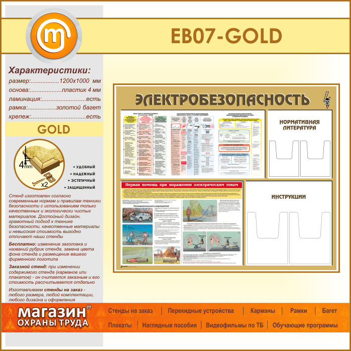 Стенд «Электробезопасность» с 4 объемными карманами (EB-07-GOLD) в Королёве купить