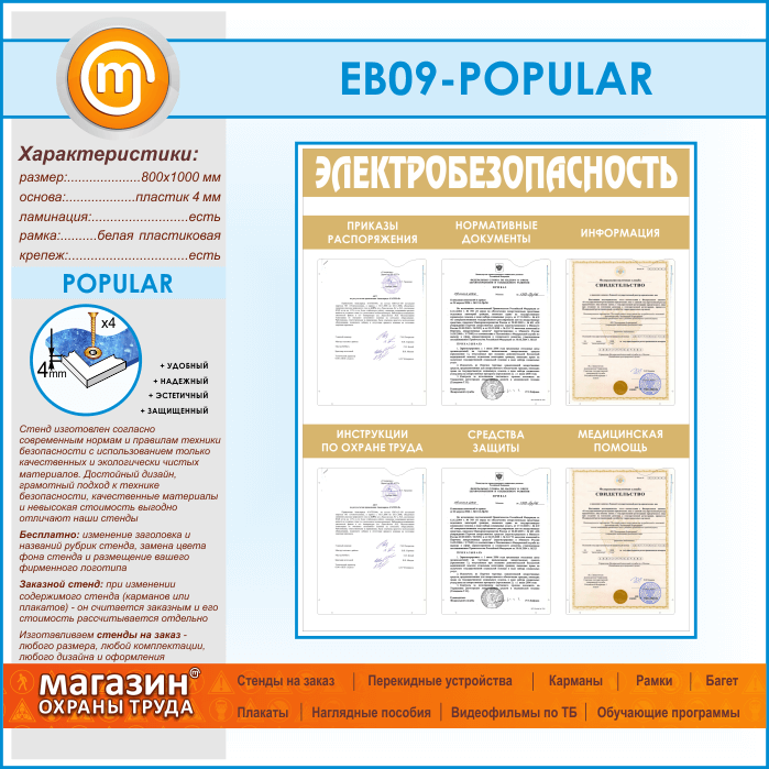 Стенд «Электробезопасность» с 6 карманами (EB-09-POPULAR) в Королёве купить