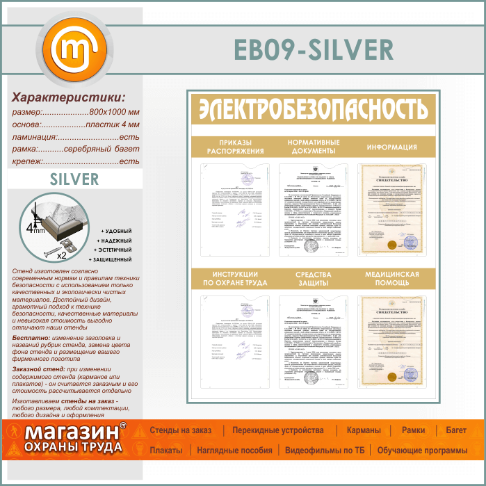 Стенд «Электробезопасность» с 6 карманами (EB-09-SILVER) в Королёве купить