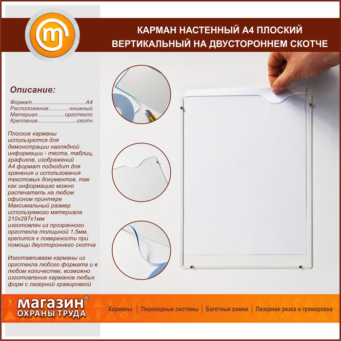Карман настенный А4 плоский вертикальный на двустороннем скотче в Королёве купить
