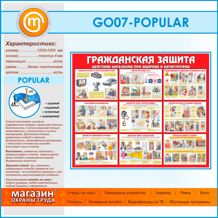 Стенд «Гражданская защита» – действия населения при авариях и катастрофах – обучение действиям при авариях на транспорте и авариях с выбросом аммиака, правилам поведения на радиоактивно загрязненной местности и действиям при разливе ртути. Научит Вас, как действовать при авариях со взрывами и пожаром, с выбросом хлора, напомнит о средствах оповещения населения в случае угрозы чрезвычайной ситуации…