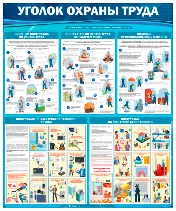 Стенд «Уголок охраны труда» (OT-36.2) содержит вводный инструктаж по ОТ, инструктаж по ОТ на рабочем месте, информацию об опасных производственных факторах, а также инструктажи по электробезопасности и по пожарной безопасности.